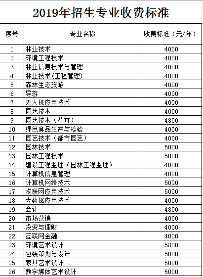 山西林业职业技术学院2019年招生专业收费标准
